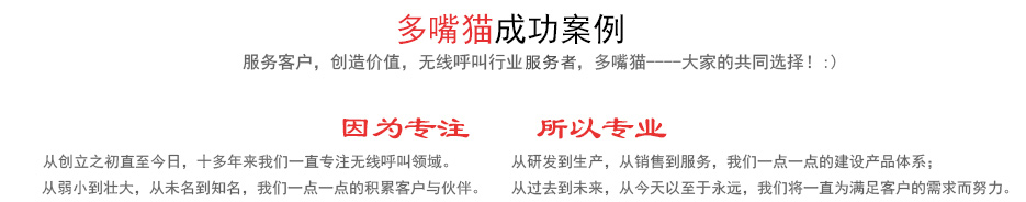 有句名言說(shuō)的是“世界上沒(méi)有比人更高的山,沒(méi)有比腳更長(zhǎng)的路”, 而這風(fēng)塵仆仆一步一個(gè)腳印走出的路程,正是見(jiàn)證多嘴貓壯人心魄的發(fā)展歷程。多嘴貓產(chǎn)品自2002年以來(lái)一直笑傲整個(gè)無(wú)線(xiàn)呼叫領(lǐng)域,為廣大客戶(hù)所親睞,不單是與多嘴貓產(chǎn)品高新的技術(shù)和精美的外觀(guān)分不開(kāi),也與多嘴貓全面入微售后服務(wù)也有很大聯(lián)系。