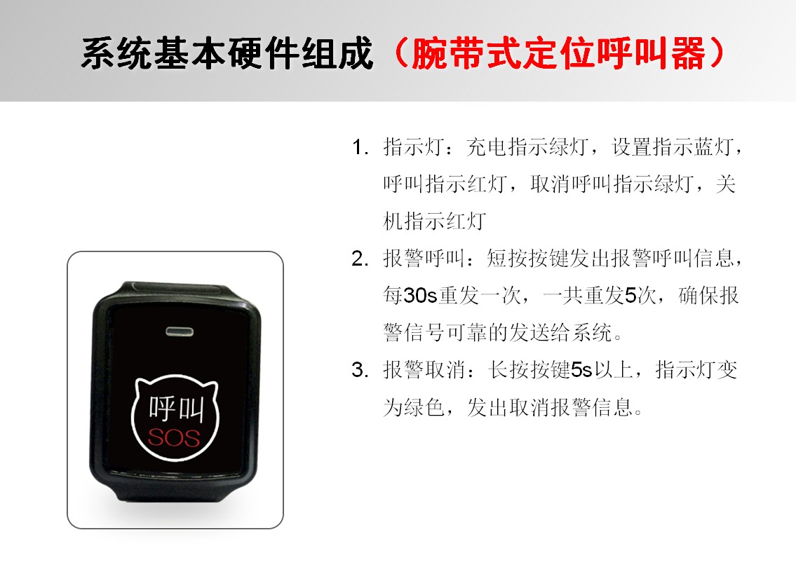 腕帶式無線定位報(bào)警求助按鈕,按鍵可同時(shí)發(fā)送呼叫者身份信息和報(bào)警位置信息,一充電一般可用15-30天。