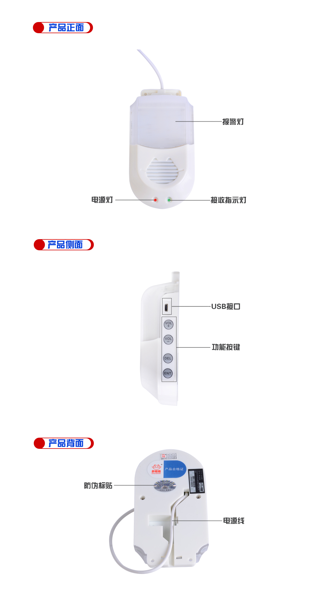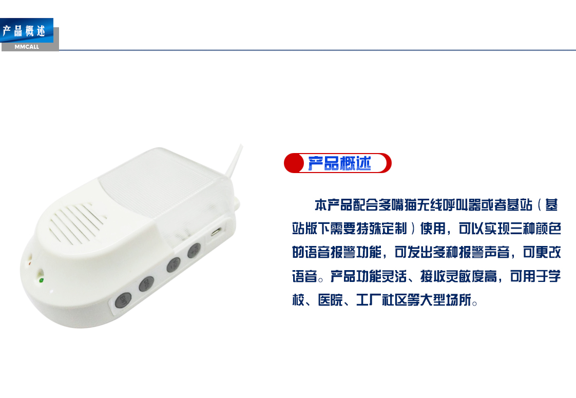 本產(chǎn)品配合多嘴貓無線呼叫器或者基站(基站版下需要特殊定制)使用,可以實(shí)現(xiàn)三種顏色的語音報(bào)警功能,可發(fā)出多種報(bào)警聲音,可更改語音。產(chǎn)品功能靈活、接收靈敏度高,可用于學(xué)校、醫(yī)院、工廠社區(qū)等大型場(chǎng)所。