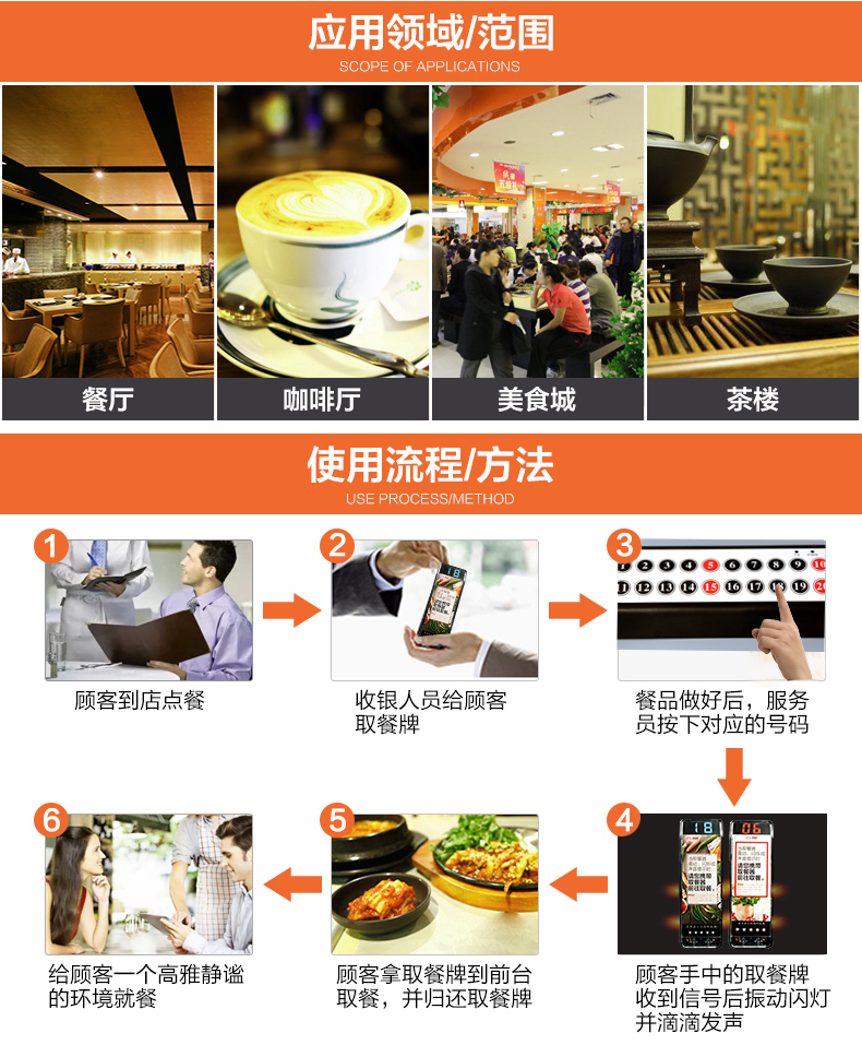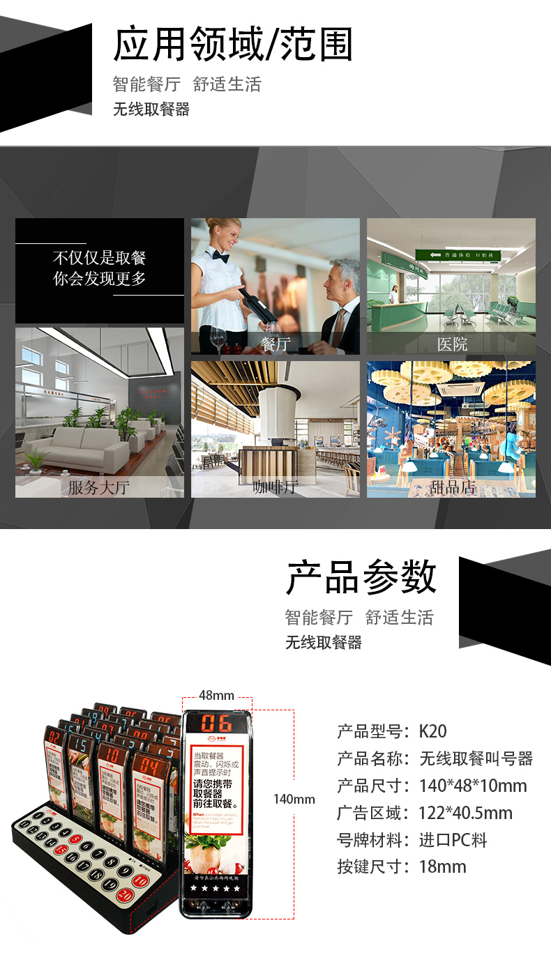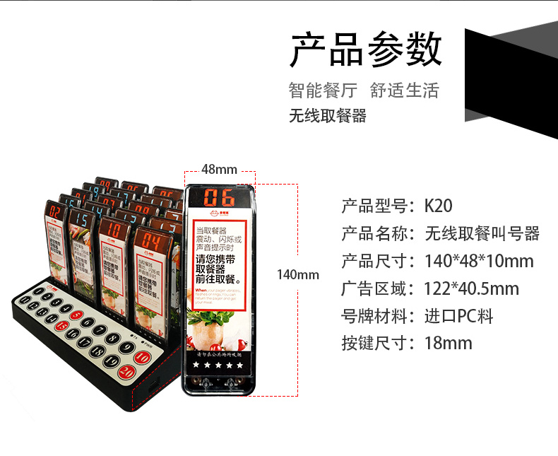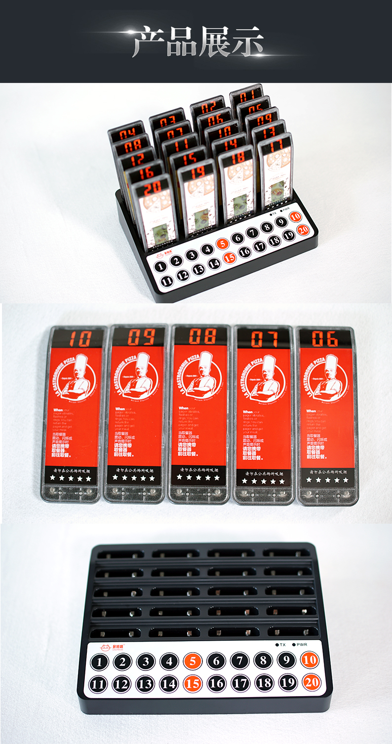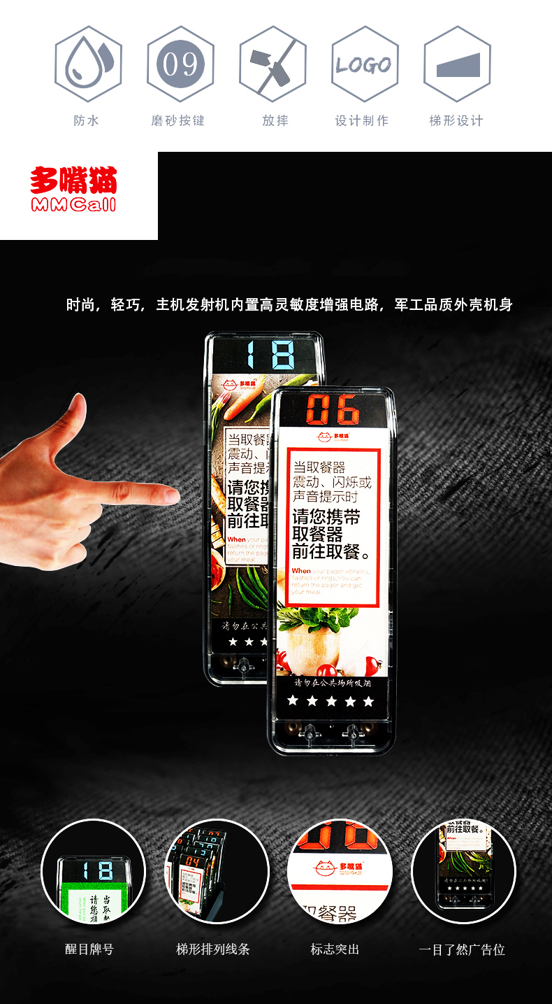 特點:多嘴貓經濟型無線取餐呼叫系統(tǒng),產品信號覆蓋距離遠,取餐呼叫器設計新穎,適合中小餐飲、娛樂等服務場所。
