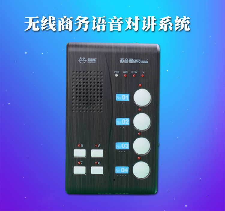 特點:通話清晰,音量可調(diào),內(nèi)置進口語音芯片,通話清晰,避免干擾,操作簡單。一鍵通話,按住就可以講話,無需撥號,無需等待。距離遠,無線信號強,標(biāo)準(zhǔn)版可覆蓋1-5層樓,遠距離款可覆蓋8層樓。
