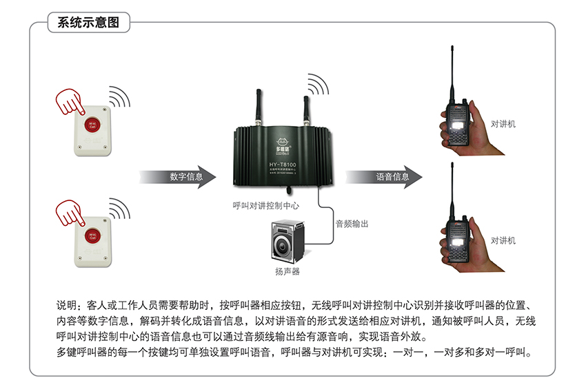 兼容多嘴貓所有調(diào)頻無線呼叫器。包括:單鍵呼叫器、多鍵呼叫器、防水呼叫器、面板呼叫器、手柄呼叫器、防爆呼叫器、報警呼叫器、退房呼叫器和工程呼叫器等,產(chǎn)品適應餐飲、娛樂休閑、工廠、銀行、超市、辦公、家庭、政府和軍隊等多個行業(yè)。