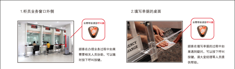 方案二:銀行服務(wù)無線呼叫解決方案:【自助取款設(shè)備、單據(jù)填寫處、VIP財務(wù)中心、無障礙通道、愛心座位等位置的幫助呼叫。】