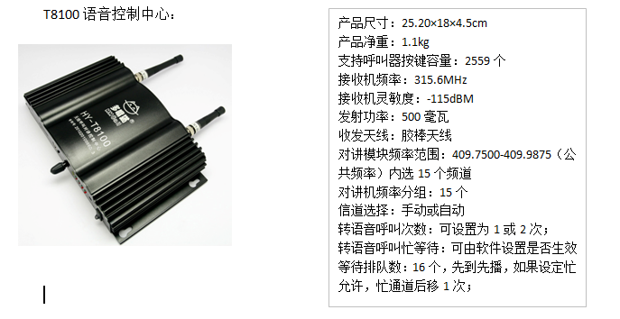 多嘴貓HY-T8100無線呼叫對講通訊系統(tǒng)包括無線呼叫對講控制中心、多嘴貓調(diào)頻無線呼叫器和對講機(jī)。該系統(tǒng)將無線呼叫器與對講機(jī)相結(jié)合,既可實現(xiàn)快捷呼叫,又可實現(xiàn)語音對講接收,充分瓦據(jù)了對講機(jī)的應(yīng)用價值,使用普通對講機(jī)就可以接收無線呼叫器的信號成為一種全新應(yīng)用。