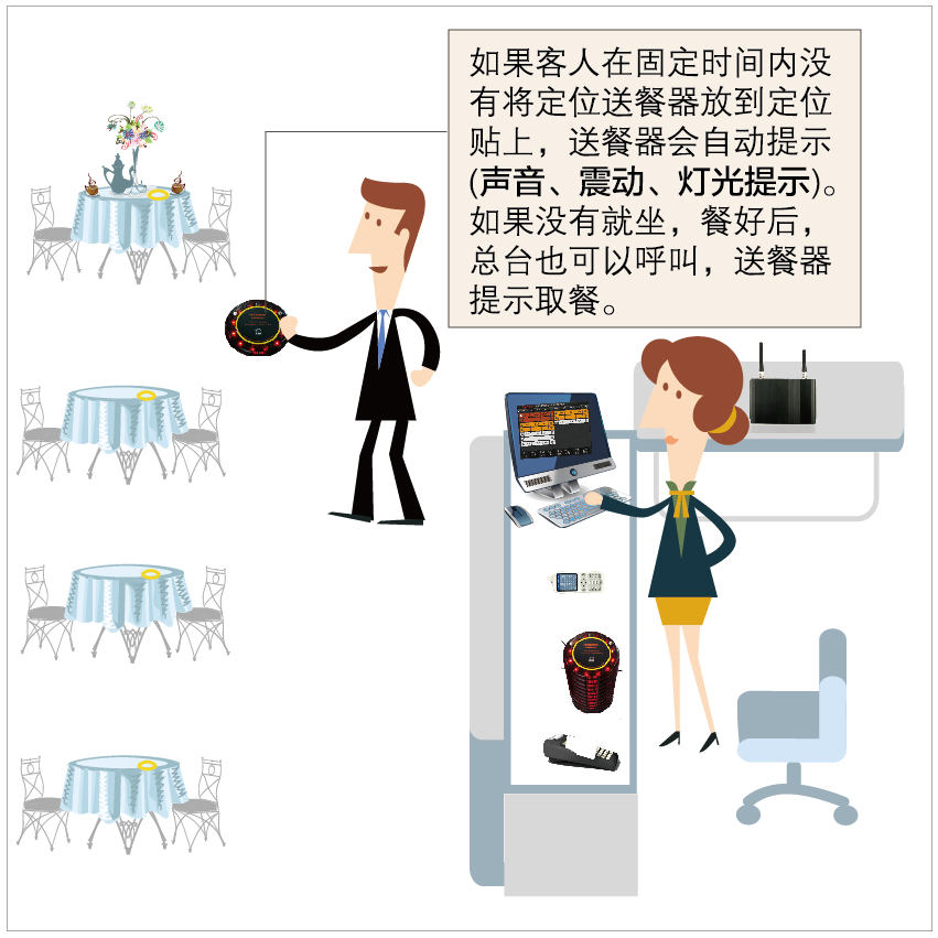 內(nèi)置無(wú)線(xiàn)通訊和讀取RFID的功能,用于定位顧客就座在哪個(gè)餐桌,帶聲、光、震動(dòng)提示。
