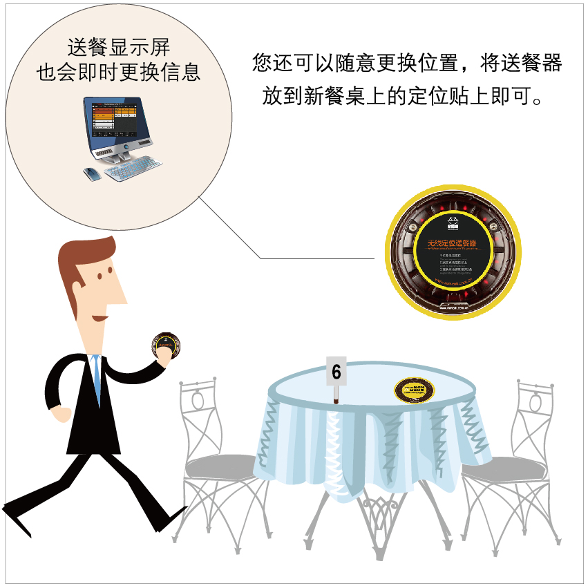 如果顧客定位餐桌后,又換臺(tái),只要再讀取一下新桌子的定位ID卡即可更新送餐顯示屏上的桌號(hào)信息。